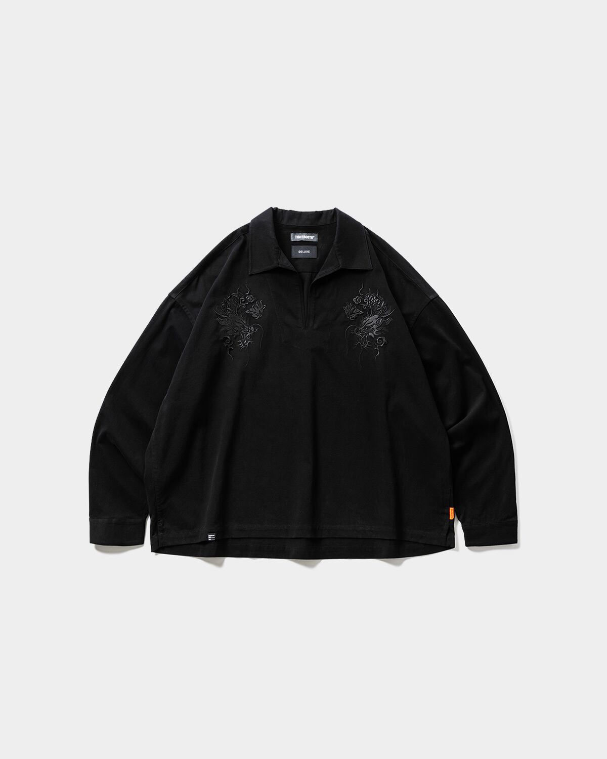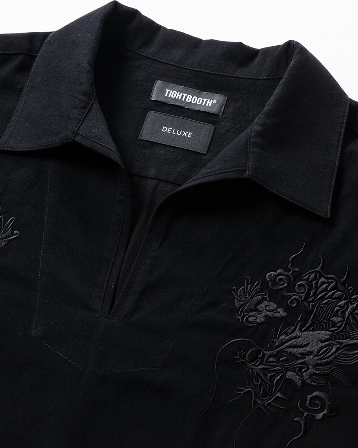 TDELUXEとのコラボレーションアイテム。程よい厚みと柔らかさのあるコットンフランネル生地を使用。フロントの両胸にオリジナルデザインのドラゴンの刺繍入り。袖口仕様は"イッテコイ"仕様。カフスボタンには両ブランドのロゴを刻印。ヨークに挟み込んだギャザーにより立体的なシルエットに。左下シームにTIGHTBOOTHのオレンジのピスネーム、裾右側にDELUXEの挟みネーム付き。