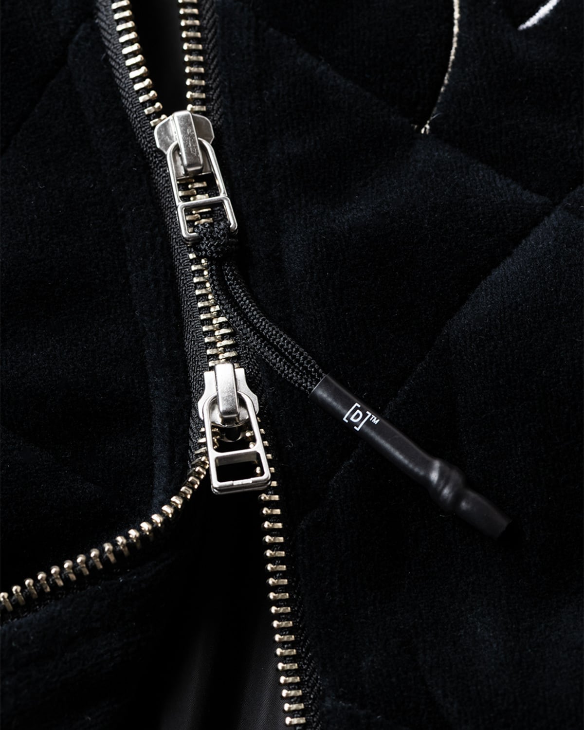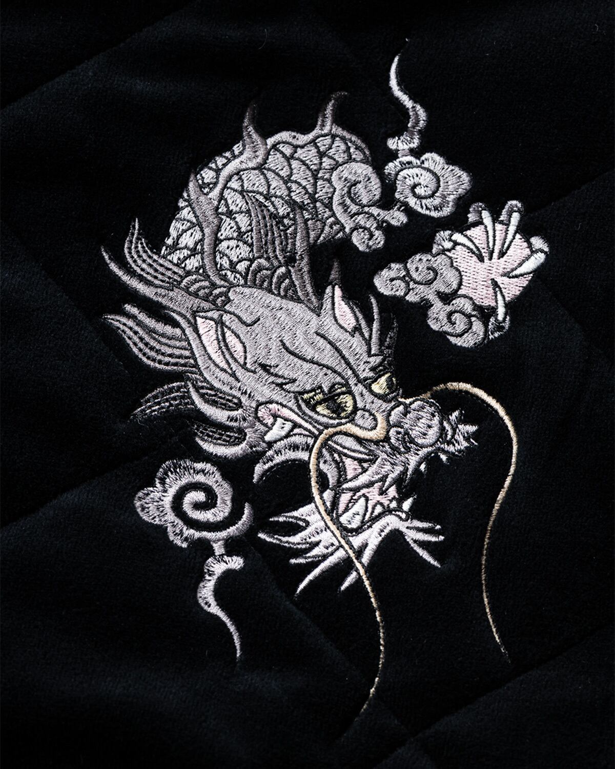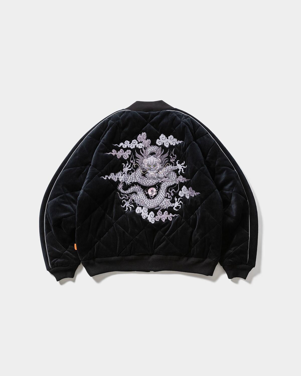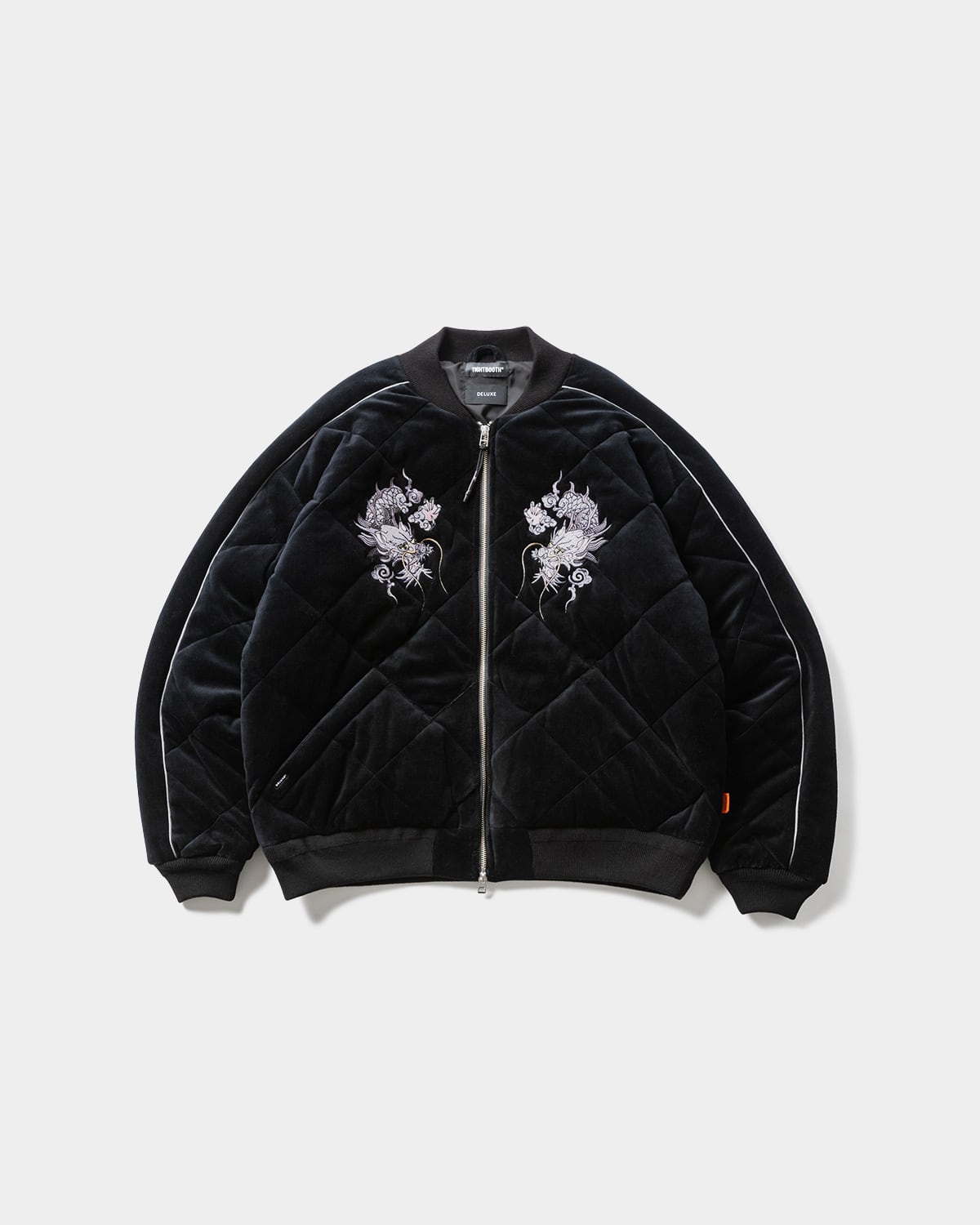 DELUXEとのコラボレーションアイテム。ベロア生地にキルティングステッチを施したMA-1スタイルのスーベニアジャケット。両胸とバック中央にはオリジナルデザインのドラゴン刺繍入り。ショルダーから袖にかけてパイピングを施した切り替えデザイン。フロントオープニングは逆開可能なダブルファスナー仕様。左右にキルティングラインに合わせたファスナーポケット。内側にはメッシュ素材のビッグポケットを搭載。襟、袖口、裾には丈夫なリブ素材を採用。
